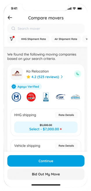 Agoyu is your advocate. We require movers to provide bound pricing, guaranteed dates, and proper insurance. We also document the condition of your goods by video to support any claims. If issues arise, simply contact Agoyu—we’ll handle them on your behalf. Movers who don’t resolve complaints are removed from our platform, giving you peace of mind and accountability every step of the way.
