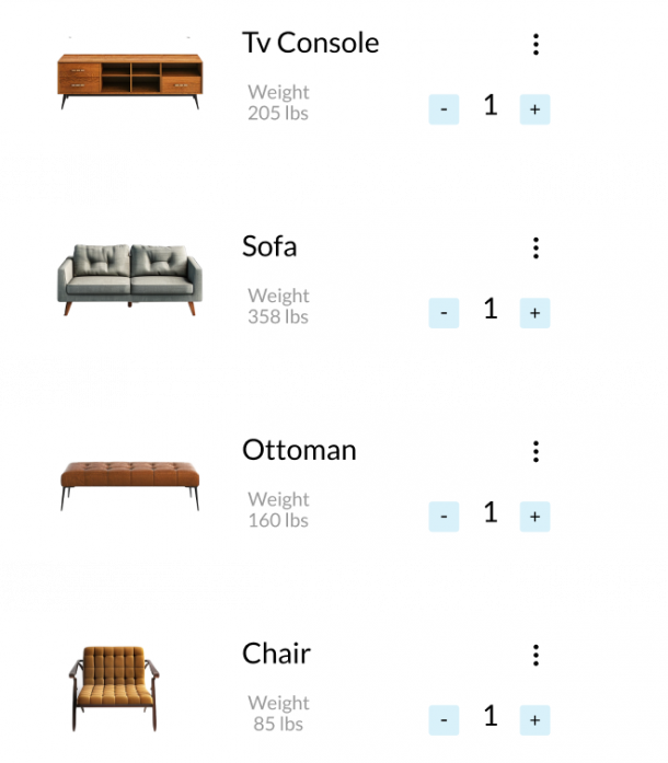 Know your shipment’s weight? Great! If not, use the Agoyu calculator or app. Quickly scan your rooms with your smartphone—our AI instantly lists your items and calculates their weight.